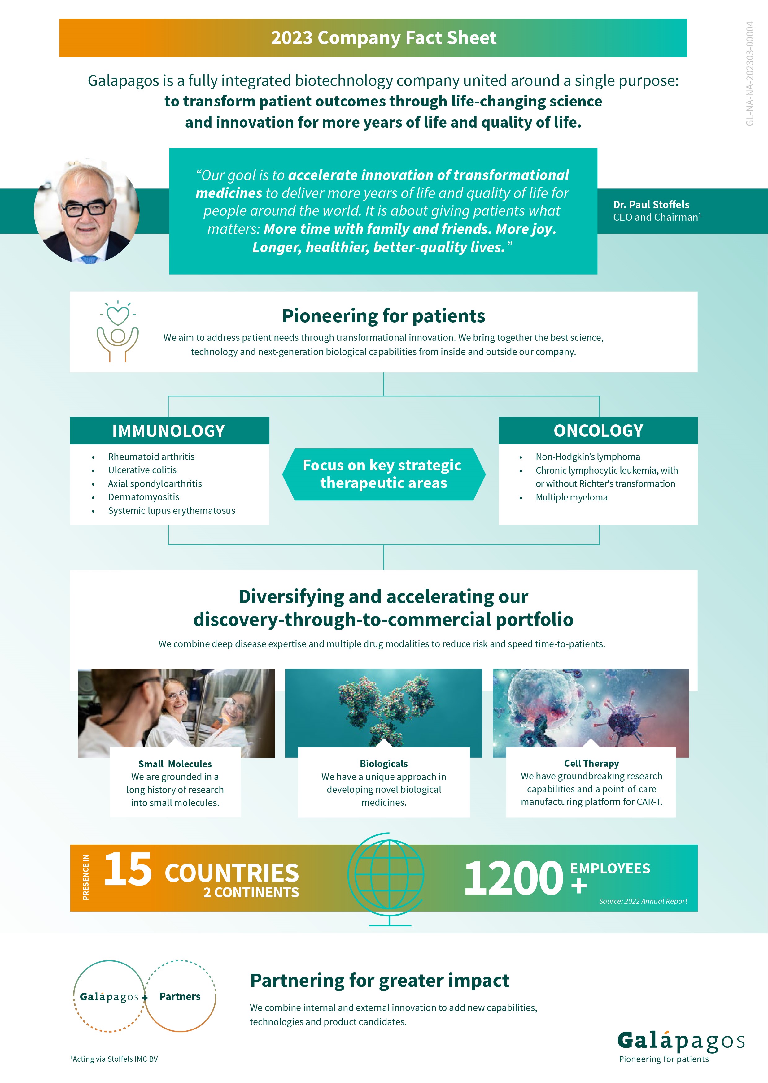 Galapagos is a fully-integrated biotechnology company united around a single purpose: to transform patient outcomes through the relentless pursuit of life-changing science and innovation for more years of life and quality of life for people around the world. We focus on immunology and oncology, key strategic therapeutic areas where we have developed deep scientific expertise and a robust discovery-through-Phase 4 portfolio of drug candidates and capability in multiple drug modalities, including small molecules and cell therapies. Through collaboration, we aim to add new capabilities, technologies and product candidates with the potential to change treatment paradigms.